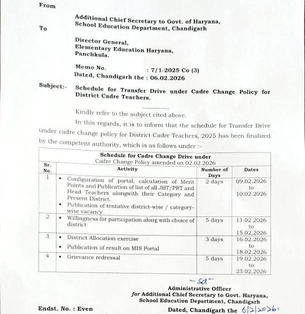 हरियाणा सरकार ने डिस्ट्रिक्ट कैडर टीचर्स (JBT/PRT व Head Teachers) के लिए कैडर चेंज पॉलिसी 2025 के अंतर्गत ट्रांसफर ड्राइव का पूरा शेड्यूल जारी किया है। शेड्यूल 2 फरवरी को 2026 को संशोधित नीति के अनुसार लागू होगा।