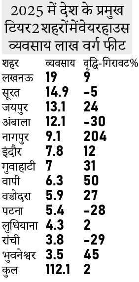 देश में क्विक कॉमर्स के विस्तार के बीच जयपुर में साल 2025 के दौरान 13 लाख वर्ग फीट वेयरहाउस स्पेस किराये पर ली या खरीदी गई, जो 2024 के मुकाबले 24 फीसदी ज्यादा है। वेयरहाउस स्पेस के कुल व्यवसाय के मामले में भी जयपुर देश के प्रमुख टियर 2 शहरों में तीसरे नंबर पर पहुंच गया। इसने नागपुर, इंदौर और लुधियाना जैसे शहरों को पीछे छोड़ दिया। हालांकि, वेयरहाउस स्पेस व्यवसाय में ग्रोथ के लिहाज से नागपुर 200 फीसदी से ज्यादा की वृद्धि के साथ अव्वल है।
