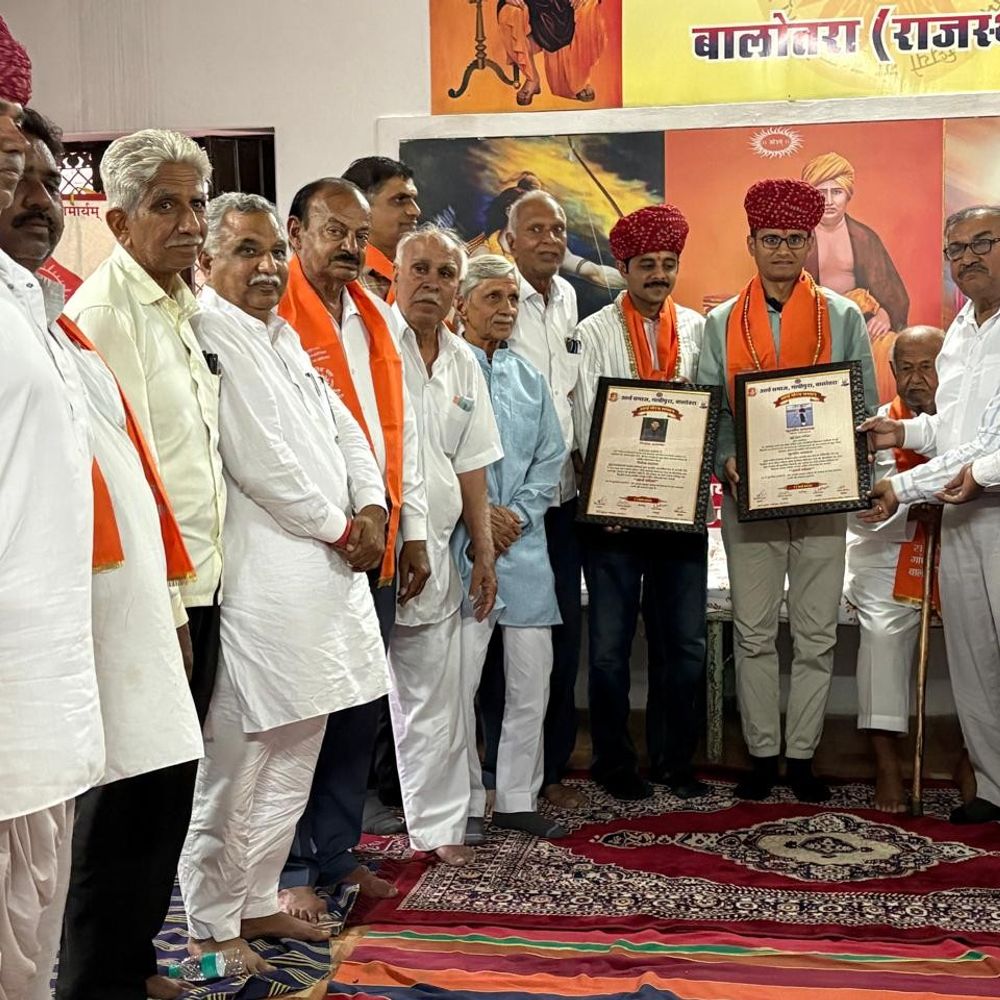बालोतरा के गांधीपुरा स्थित आर्य समाज परिसर में एक समारोह आयोजित किया गया। इसमें भारतीय प्रशासनिक सेवा (IAS) में 287वीं रैंक से चयनित जितेंद्र प्रजापत और भारतीय सेना में लेफ्टिनेंट पद पर चयनित कुलदीप कच्छवाहा को ‘आर्य गौरव’ सम्मान से सम्मानित किया गया। इस अवसर पर दोनों युवाओं के माता-पिता को भी सम्मानित किया गया। निरंतर परिश्रम करने का आह्लान समारोह में वक्ताओं ने कहा कि इन दोनों युवाओं की उपलब्धियां उनके परिवार, क्षेत्र और समाज के लिए गर्व का विषय हैं। उन्होंने युवाओं से जीवन में स्पष्ट लक्ष्य निर्धारित कर निरंतर परिश्रम करने का आह्वान किया। लेफ्टिनेंट कुलदीप कच्छवाहा आर्य समाज गांधीपुरा, बालोतरा के पूर्व छात्र रहे हैं। उन्होंने अपने नवोदय विद्यालय में चयन का श्रेय गणपतलाल गहलोत को दिया। कई गणमान्य लोग रहे मौजूद कार्यक्रम में दिलीप गहलोत, नरेश पंवार, वागाराम पंवार, राजेंद्र गहलोत, मंगलाराम पंवार, गोविंदराम परिहार, अचलचंद गहलोत, बृज मनोहर पिथानी, चंपालाल सुन्देशा, मांगीलाल पंवार, महेंद्र सुन्देशा, राधेश्याम पंवार, मंशाराम पंवार, सांवलचंद पंवार, मांगीलाल परमार, संतोष पंवार सहित अनेक गणमान्य नागरिक उपस्थित रहे। समारोह के अंत में उपस्थित लोगों ने दोनों चयनित युवाओं के उज्ज्वल भविष्य की कामना की। उन्होंने विश्वास व्यक्त किया कि वे राष्ट्र सेवा में उत्कृष्ट कार्य कर समाज और देश का नाम रोशन करेंगे।