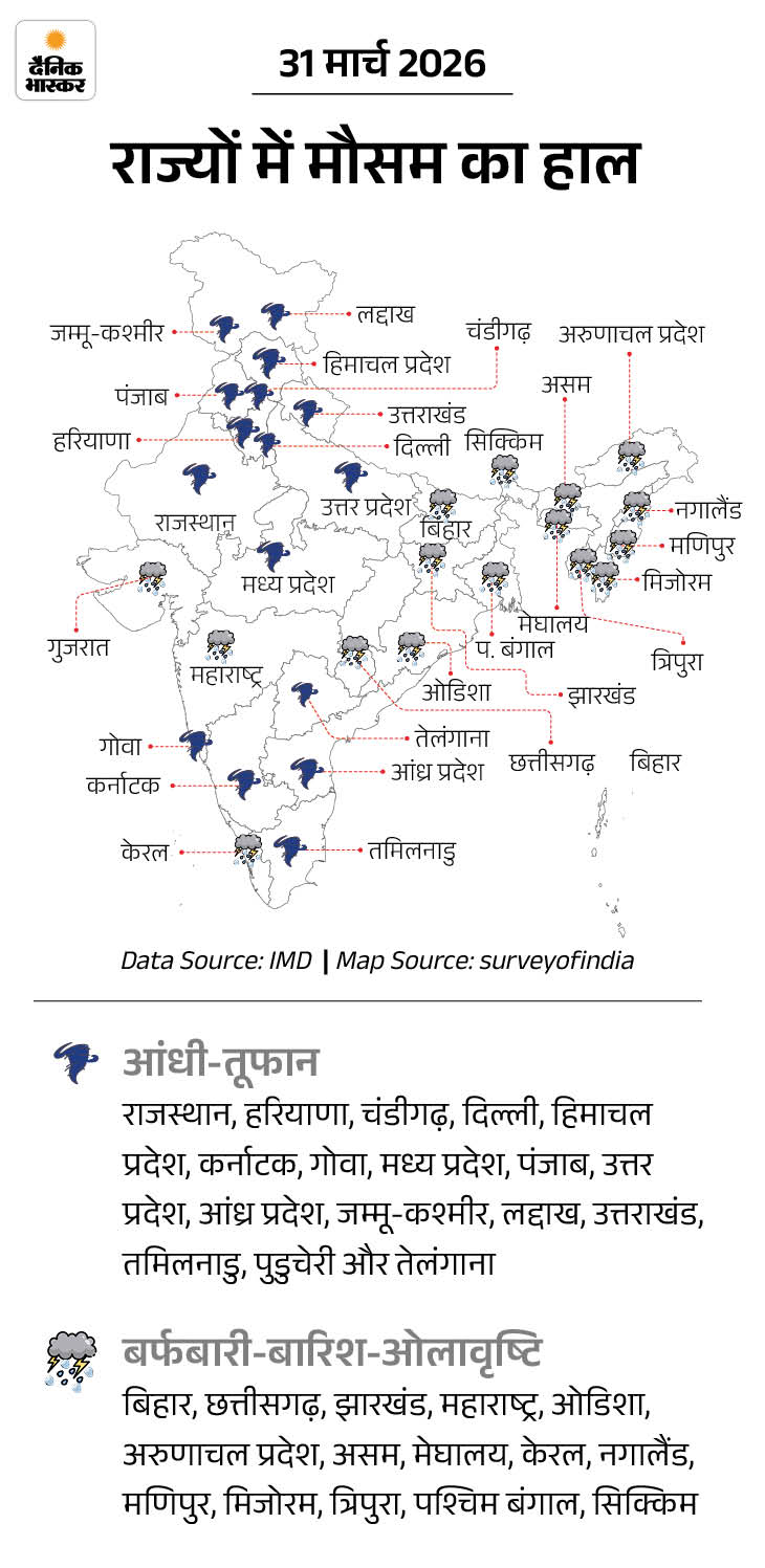 - 1 अप्रैल- असम, मेघालय, नगालैंड, मणिपुर, मिजोरम और त्रिपुरा में तेज बारिश की चेतावनी। छत्तीसगढ़ में ओलावृष्टि की चेतावनी। तेलंगाना, कर्नाटक, आंध्र प्रदेश, केरल में हल्की बारिश की संभावना।