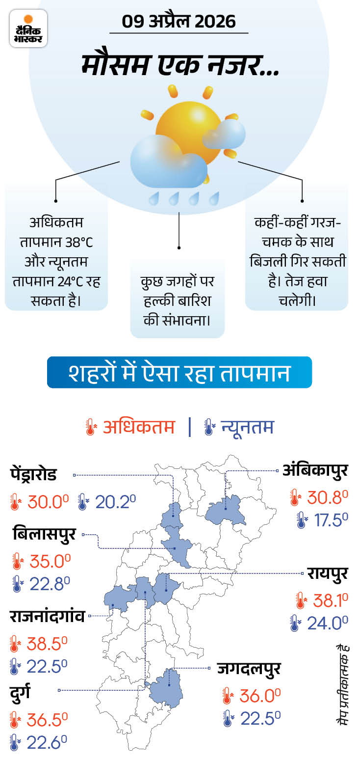 वहीं, सबसे अधिक अधिकतम तापमान राजनांदगांव में 38.5°C और सबसे कम न्यूनतम तापमान अंबिकापुर में 17.5°C दर्ज किया गया।