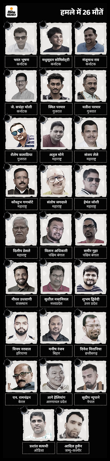 22 अप्रैल, 2025 का दिन, जब बैसरन घाटी में अटैक हुआ दोपहर करीब 2 बजे की बात है। टूरिस्ट के ग्रुप घाटी में वीडियो-फोटो शूट कर रहे थे। उसी वक्त तीन आतंकी जंगल की ओर से आए और गोलियां बरसाने लगे। पहली गोली करीब 2.20 बजे चली। शुरुआत में किसी को समझ नहीं आया कि क्या हुआ है। जब लाशें गिरने लगीं, तब लगा कि हमला हुआ है। लोग बचने के लिए भागे, लेकिन उस मैदान में छिपने की जगह ही नहीं थी। हमले में कुल 26 लोग मारे गए।