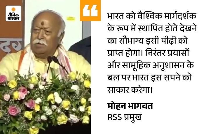 भारत के भविष्य पर संदेह न करें- भागवत RSS चीफ ने कहा- देश के भविष्य को लेकर कोई संदेह न रखें और साहस व आत्मनिर्भरता के साथ जीवन जीएं। उनके मुताबिक, अगर लोग अपने संकल्प के अनुसार कदम-दर-कदम आगे बढ़ें, तो भारत मजबूत और नैतिक रूप से सशक्त बनेगा।